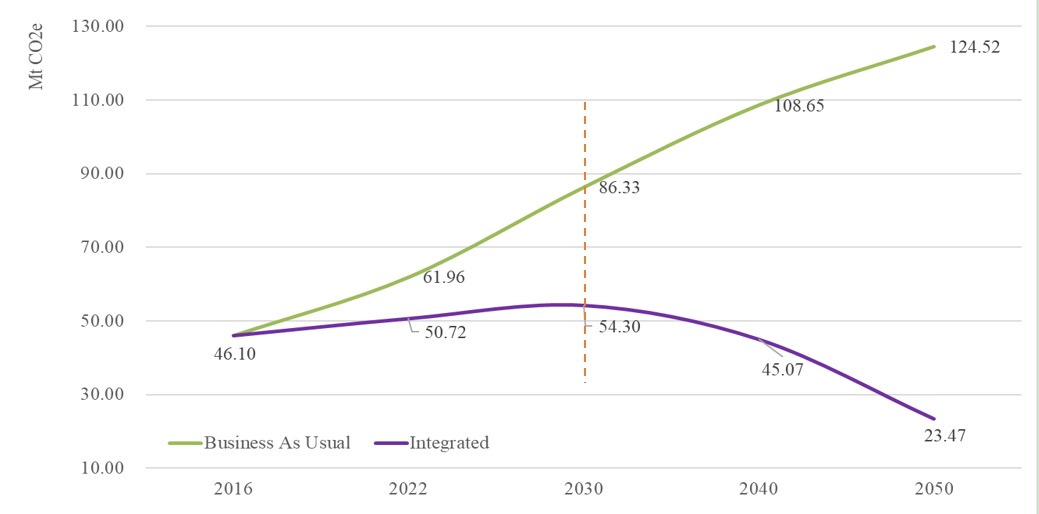 图1 2016-2050年常规情景和综合情景下温室气体排放趋势