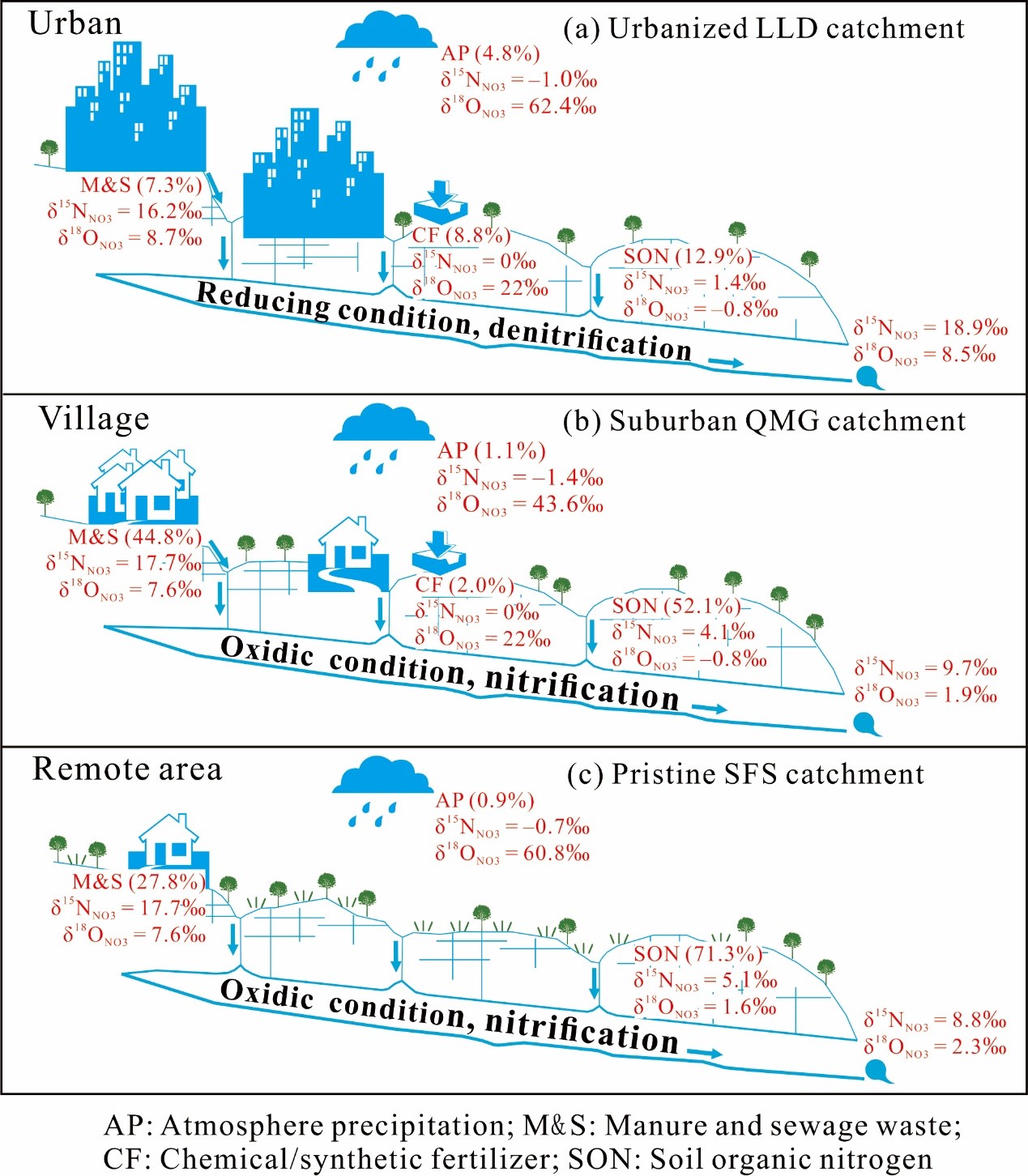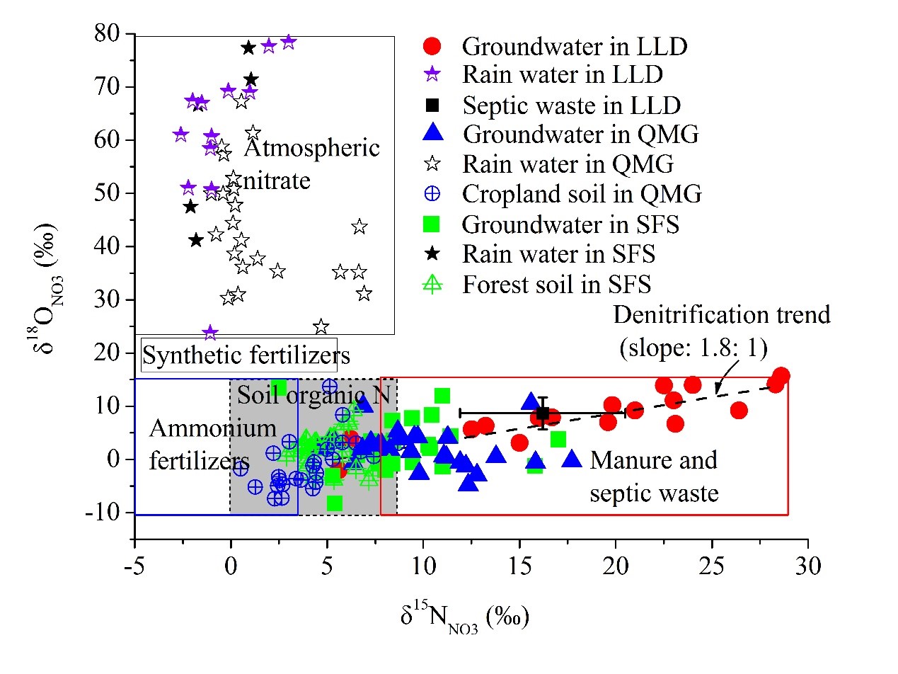 硝酸盐(NO3–)是生命体运行必不可少的营养物质。然而,自然界水体中过高的硝酸盐浓度会带来一系列的环境危害,如富营养化;人类饮用过高硝酸盐浓度的水则会严重威胁人类的生命健康,如引起高铁血红蛋白症、癌症、甲状腺肿大,损坏基因。二战后至今,过量的施肥、无序的污水排放等人类活动是造成水体硝酸盐浓度超标问题的主要原因,威胁着生态环境和供水安全。因此,如何精确定位硝酸盐的污染源头,辨别硝酸盐随水流运动所发生的浓度富集和生物降解等过程,是硝酸盐污染防治最为关键的科学问题。
