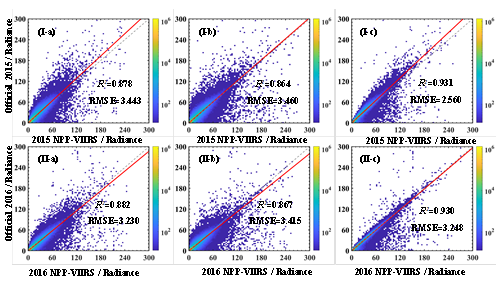图5. Ⅰ:2015年官方年度SNPP-VIIRS数据与 (b) 去除5-8月数据的均值合成年数据,(b) 权重均值法合成年数据,(c) 缺失数据修复后的均值合成年数据的散点图;Ⅱ:2016年官方年度SNPP-VIIRS数据与 (a) 去除5-8月数据的均值合成年数据,(b) 权重均值法合成年数据, (c) 缺失数据修复后的均值合成年数据的散点图