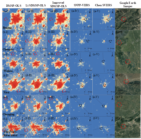 夜间灯光遥感数据可以有效记录人类活动中人造光产生的辐射信号。这些数据已被广泛应用于监测与评估多尺度社会经济活动发展与变化。目前,Defense Meteorological Satellite Program’s Line Scanner System (DMSP-OLS) 和Suomi National Polar-orbit Partnership’s Visible Infrared Imaging Radiometer Suite (SNPP‐VIIRS) 数据是应用最广泛的两类夜间灯光遥感数据。但是,1992-2013年DMSP-OLS数据由不同卫星传感器获取,且缺乏机载校准和传感器退化导致数据不兼容,从而限制了该类数据的广泛应用。作为DMSP-OLS数据的“继承者”,SNPP-VIIRS获取的夜间灯光数据 (2012-至今) 可用于继续监测人类活动,然而该类数据的可用性受到瞬态光源和背景噪声的严重影响。例如,极光可能会干扰传感器探测中高纬度地表夜间灯光的能力,从而导致SNPP-VIIRS部分地区数据缺失。此外,由于光谱分辨率、空间分辨率、辐射分辨率、产品更新周期等方面的差异,DMSP-OLS和SNPP-VIIRS数据不兼容,难以实现对社会经济活动的长期监测与分析。