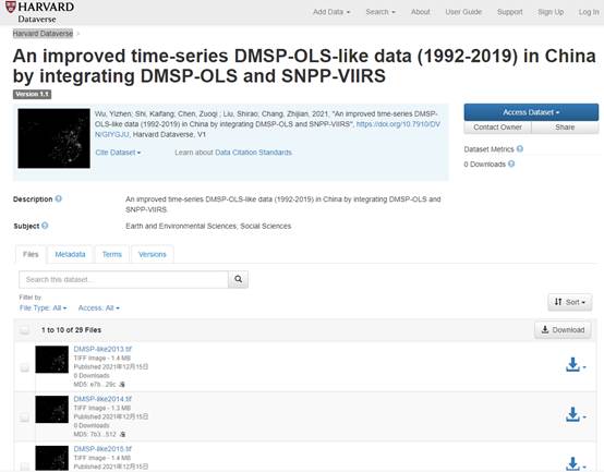 此外,1992-2019年中国“类DMSP-OLS”夜间灯光遥感数据集已通过Harvard Dataverse平台免费发布,用户可以通过下方链接直接获取,数据存储格式为GeoTIFF,空间分辨率为1-km:(https://dataverse.harvard.edu/dataset.xhtml?persistentId=doi:10.7910/DVN/GIYGJU)。
