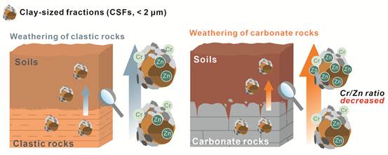 不同母质的化学风化是驱动铬(Cr)和锌(Zn)等元素在地表再分配的关键过程。粘粒(<2 μm)是主要的风化产物之一,也是 Cr和Zn在地表的重要载体。对粘粒Cr和Zn形态的研究有助于深入解读Cr/Zn比值的风化地球化学内涵。据此,本研究系统分析了碳酸盐岩、碎屑岩及其所形成的土壤中粘粒的Cr、Zn形态。结果表明,沉积岩粘粒中的超过70%的Cr主要受层状硅酸盐矿物限制,而锌则分散在不同的矿物相中。并且,在风化过程中,粘粒中的Cr普遍相对稳定,但Zn在碳酸盐岩风化过程中的富集倍数可达 4.1倍,暗示Zn的富集既来源于母岩属性的继承,也与风化中粘粒的累积有关。基于此,在碳酸盐岩风化过程中粘粒的Cr/Zn比值通常大幅下降,这意味着粘粒的Cr/Zn比值有可能是对碳酸盐岩风化敏感的元素地球化学指纹。