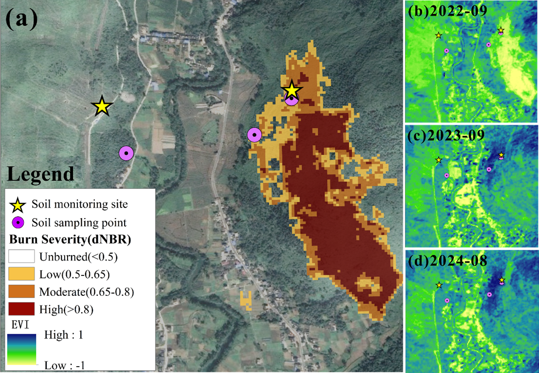 (a)根据dNBR值,烧伤严重程度分为四个等级:未燃烧、低严重程度、中等严重程度和高严重程度。(b)2022年9月增强植被指数(EVI)图像(火灾后一天);(c)2023年9月的EVI图像(火灾后一年);(d)2024年8月的EVI图像(火灾后两年)。