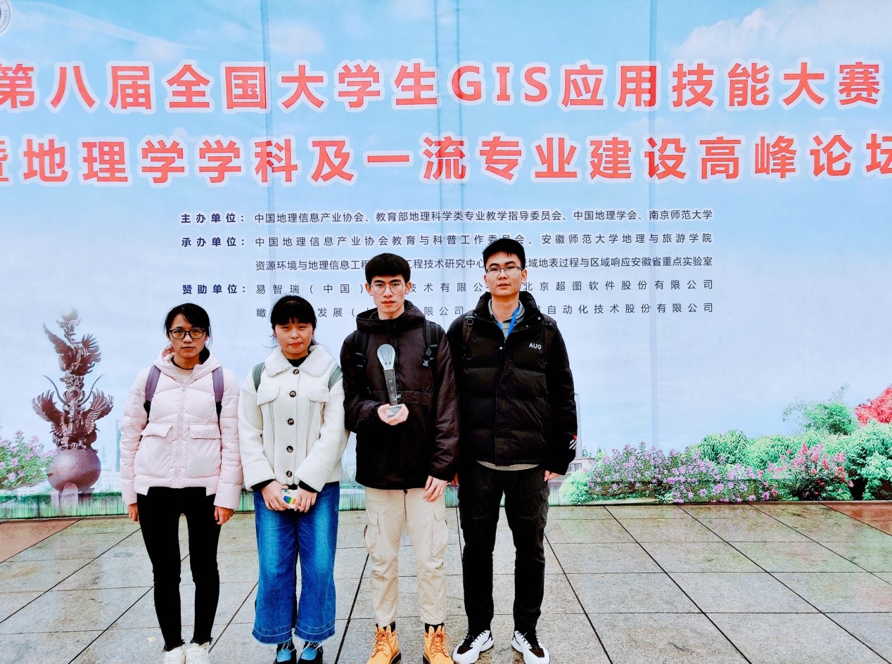 2019年11月23日至11月25日,由中国地理信息产业协会、教育部地理科学类教学指导委员会和中国地理学会主办的第八届全国大学生GIS应用技能大赛在安徽师范大学举行。由2016级、2017级地理信息科学专业本科生付康钰、王杰、毕茹、黄晓蕾组成的西南大学代表队在学院田永中、徐永进、周文佐、于文凭等指导老师的带领下参加比赛,喜获特等奖。这是我院自2013年参加本项赛事以来获得的最佳成绩,也是继去年我院获得一等奖后所取得的又一重大突破。