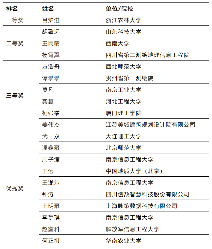 由中国信息协会与易智瑞信息技术有限公司、中科地信(北京)遥感信息技术联合举办的“2021年地理信息技术与应用技能大赛”决赛于2021年10月16日成功举行。西南大学best365英国体育在线的王雨晴同学最终综合排名第3,荣获二等奖,田永中老师荣获优秀指导老师。