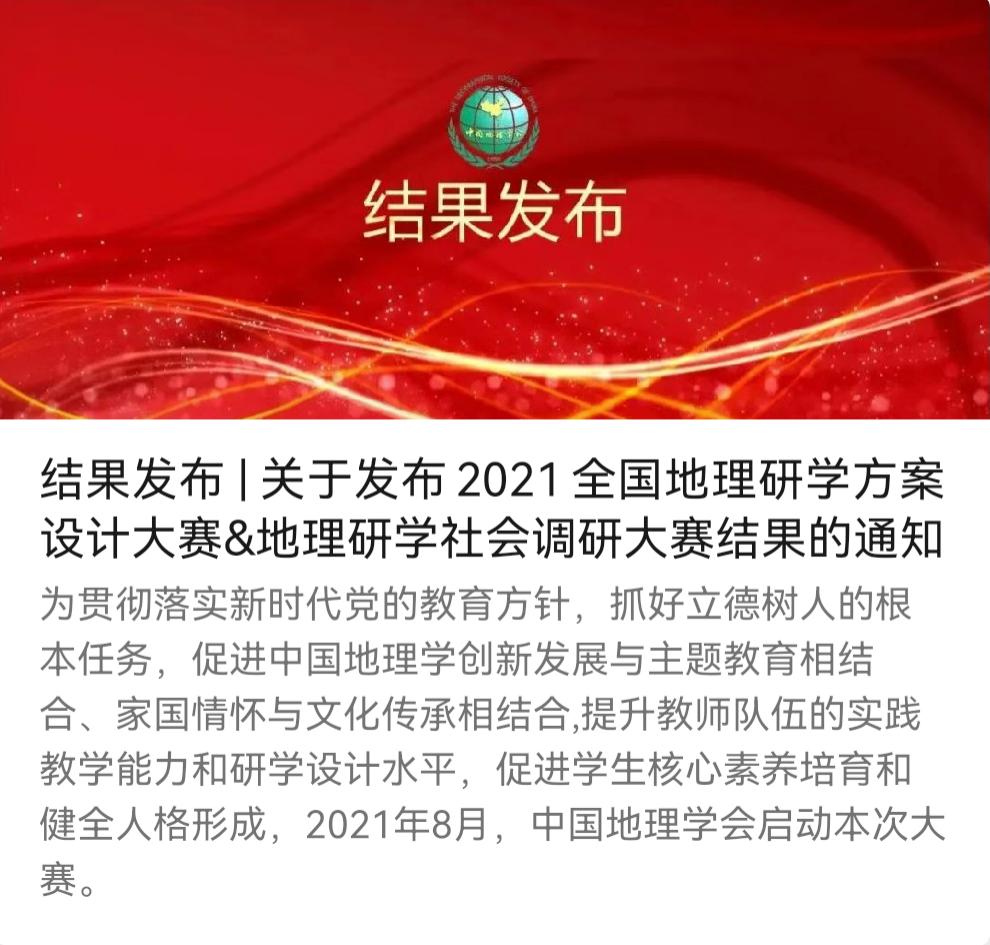 为贯彻落实新时代党的教育方针,抓好立德树人的根本任务, 2021年8月,中国地理学会启动了“2021全国地理研学方案设计大赛&地理研学社会调研大赛”。近日,中国地理学会公布了本次大赛的结果。西南大学best365英国体育在线组建的多支队伍荣获佳绩,我院学子共有9支参赛队伍获奖,其中一等奖(最高奖)2项、二等奖2项、三等奖3项、优秀奖2项。