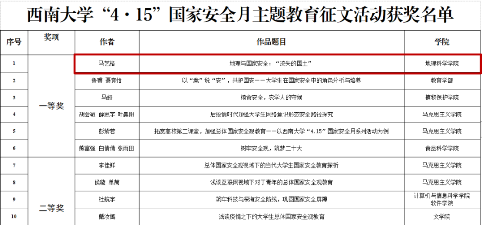 2022年6月10日,共青团西南大学委员会公布了“4·15”国家安全月主题征文活动获奖名单,我院马艺格同学的《地理与国家安全:“流失的国土”》作品荣获一等奖。