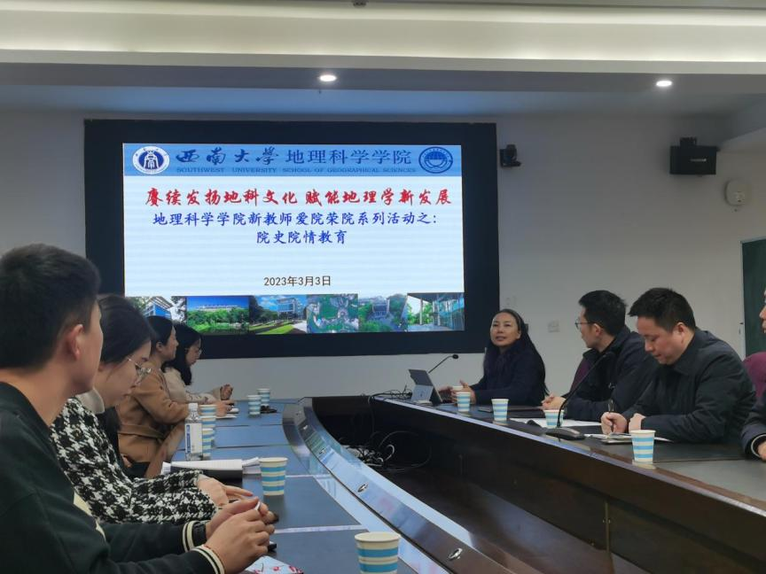 为增强新教师对校院的认同感和归属感,帮助新教师尽快适应环境,融入学院生活,2023年3月3日,院长杨庆媛教授为新教师作题为“赓续发扬地科文化 赋能地理学新发展”的院史院情教育。学院党政领导、新进教师及教师代表参会,会议由学院党委书记姚元锦主持。