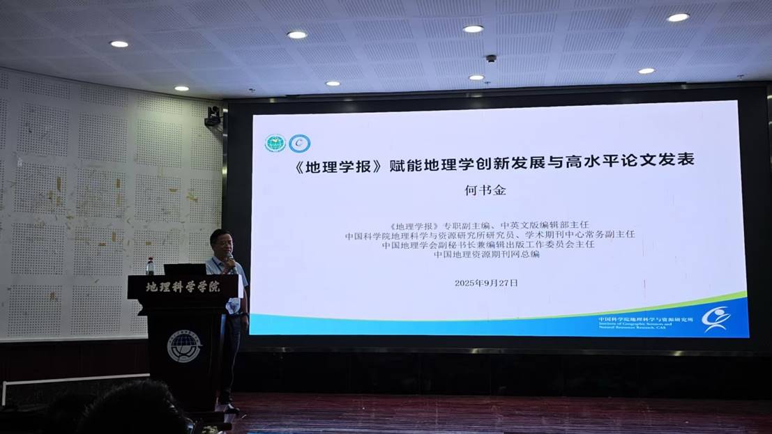 2025年9月27日下午,中国科学院地理科学与资源研究所学术期刊中心常务副主任、《地理学报》专职副主编、《地理学报》(中、英版)编辑部主任何书金研究员来到西南大学best365英国体育在线作题为“《地理学报》赋能地理学创新发展与高水平论文发表”的学术报告。学院副院长樊磊教授主持报告会,唐强院长、杨庆媛教授、王成教授、宗会明教授等师生代表200余人参会。