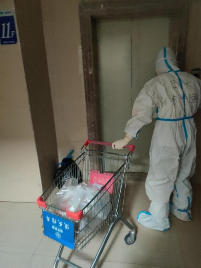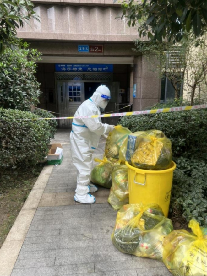 杨老师将物管送到单元楼下的所有物资一一仔细清点,装上推车,从顶楼逐层往下送,挨家挨户放到邻居们的门口。等全部生活物资送完毕,微信群通知邻居们错开时间取生活物资,并将垃圾放在门口。杨老师继续从顶楼开始收集居民的生活垃圾,装入袋子,打包提到单元楼门口的垃圾桶中。每天在单元楼下清理出的垃圾就有二十余大包。