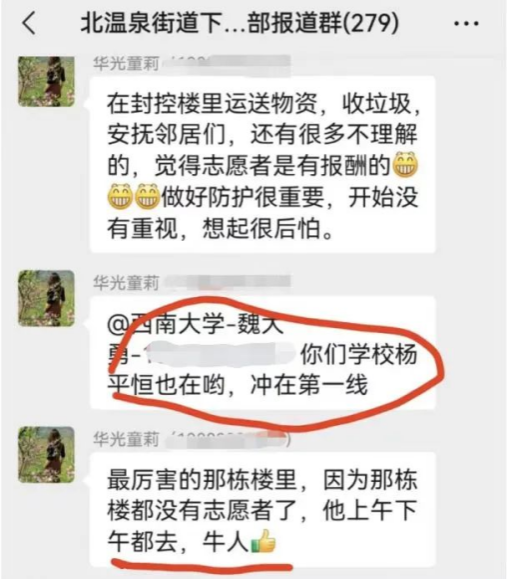 很多邻居在微信群里感谢杨老师等志愿者们的付出。杨老师的回复是:“覆巢之下无完卵。不言谢,应该的!”“覆巢之下安有完卵!辛苦也是应该的!共克时艰,希望疫情能早日结束。”