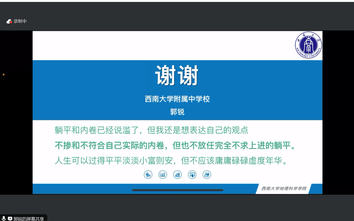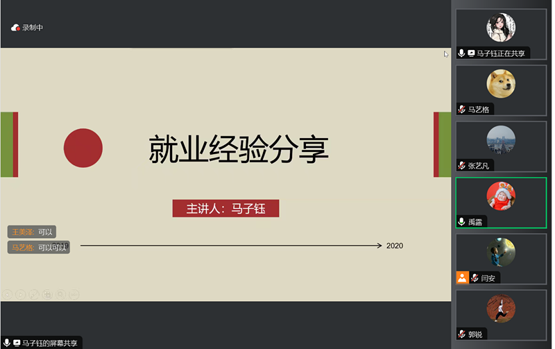 随后,来自2019级的四位优秀师范生党员为参会的低年级同学分享了求职经验。张艺璐从招聘信息获取、应聘流程一览、签约注意事项三个方面进行介绍,她谈到简历的投递要突出自身个性,不应在内容上贪多;郭锐着重提出要做好就业规划,强调就业选择前的信息检索能力,并且分享了他的个人说课经验;马子钰谈到要做好专业知识积累、片段课训练与高考题练习等一系列准备,强调就业要放平心态;岑雨濛则分享了她在重庆本地的求职经验,并详细分析了部分学校的招聘条件。